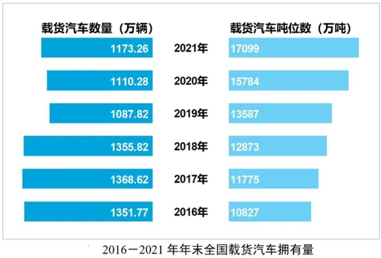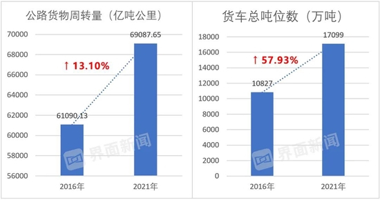 宏观数据更能说明问题。据交通部最近6年的数据,2016年全国货车数量为1351万辆,2021年为1173万辆,看上去货车数量减少了,但实际上货车的总吨位数大幅上升。