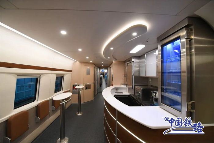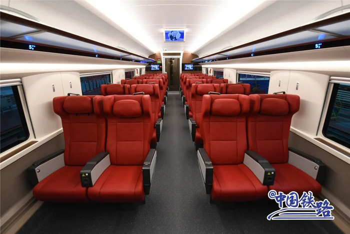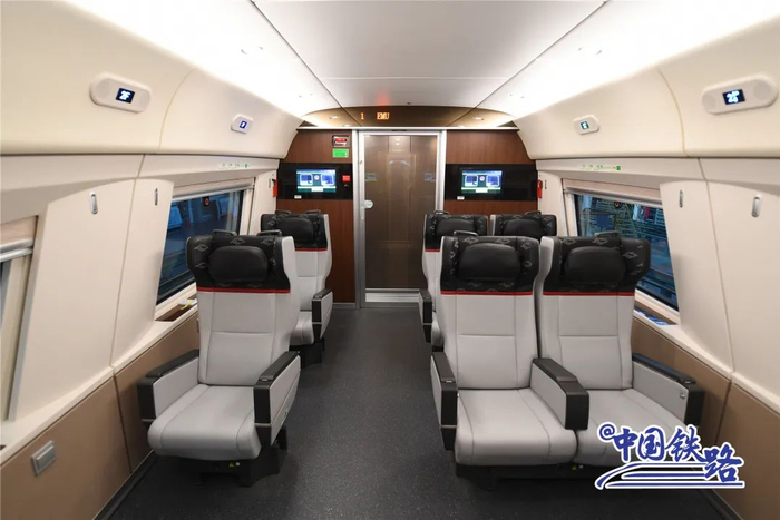 雅万高铁高速动车组载客量大、服务功能完善,乘坐舒适。该动车组采用8辆编组,设一等座车和餐车各1辆,二等座车6辆,总定员601人,包括VIP座席18人、一等座席28人、二等座席555人,需要时可实现两组动车组重联运行。4号车厢设有无障碍区,配备无障碍座椅及扶手、残疾人卫生间、SOS呼叫按钮、盲文引导标识等设施,方便残疾人旅客出行;5号餐车配置售货柜、咖啡机、冷藏柜、微波炉等设备,并设休闲吧桌,满足旅客饮食和休闲需求。