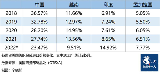 中美贸易摩擦加速了这一进程。根据美国商务部纺品处(The Office of Textiles and Apparel,OTEXA)统计数据,近几年中国占美国纺织服装进口份额逐年降低,从2018年的36.59%下降到2022年的23.47%(截至2022年5月),而印度、孟加拉国的进口份额正逐年上升。