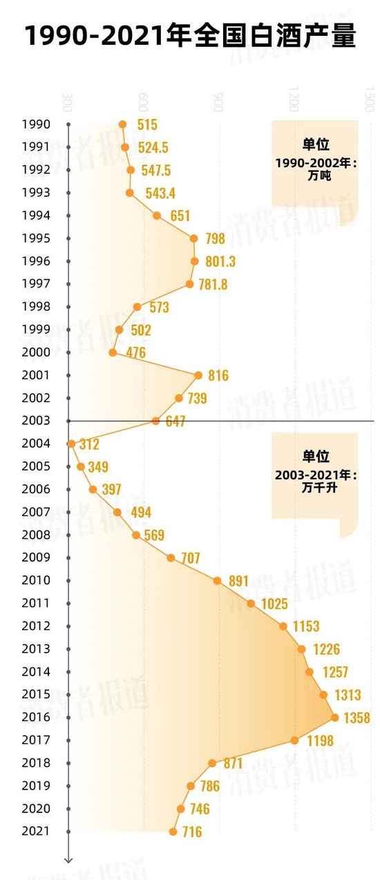 消道长整理了1990-2010年白酒产量数据,最低的年份只有312万千升。在2011年以前,产量一直在1000万吨以下,最近几年产量也有下降趋势。