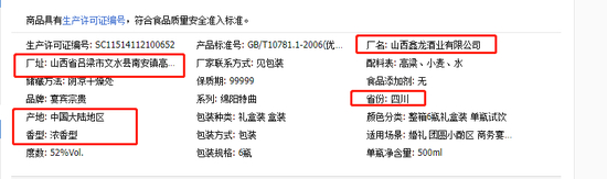 有的产品详情中甚至信息矛盾。比如“来瓶老酒”店铺中的一款名为“四川泸州老酒白酒绵阳特曲浓香型52度纯粮食原浆高度高梁送礼盒装”,其产品名和生产信息中省份、香型都显示这是一款产自四川的浓香型,而厂址和厂名却标注为了山西。