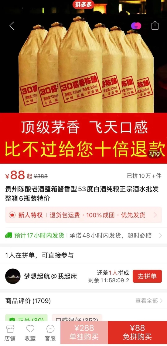 在拼多多App中,一款价格为88元/箱的“贵州陈酿老酒整箱酱香型”,其页面中标明“顶级茅香,飞天口感,比不过给您十倍退款”,夸张的类比,甚至违反广告法使用了 “顶级”的宣传语,吸引了大量客户下单,显示已拼10万+件。