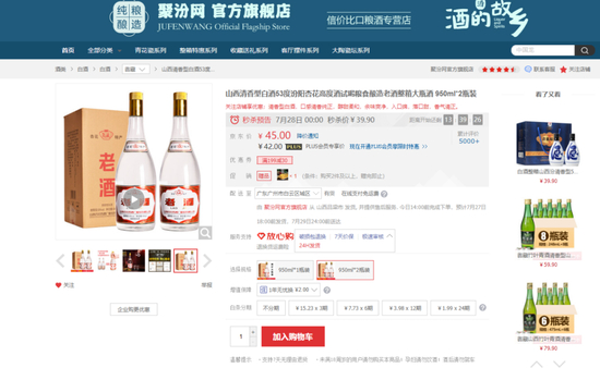 在“聚汾网”的官方旗舰店中,消道长发现一套960ml*2瓶的清香型老酒售价只需要45元,其瓶身以及外包装盒上都印有非常醒目的“老酒”二字。店内还有与青花汾酒外观非常相似的酒款,售价只需要39.9元。