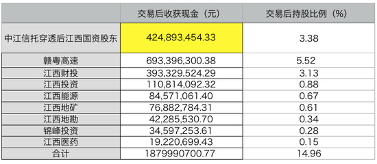 其中,8家国资股东以及中江信托中江西国资股东,总计收获现金18.8亿元,并持有交易后国盛金控总计14.96%的股权。
