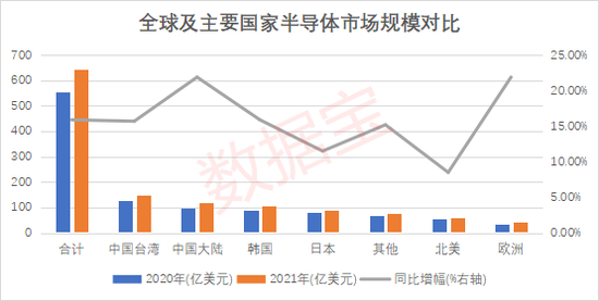 中国大陆半导体市场增速领先全球,中国台湾2021年半导体市场规模高达147.1亿美元,市场份额在全球领先,较上一年增长15.7%。