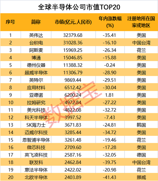 排名前20的半导体公司,年内几乎全线下跌,北欧半导体、联发科、英伟达等7家公司跌幅超过30%,台积电跌幅超15%。