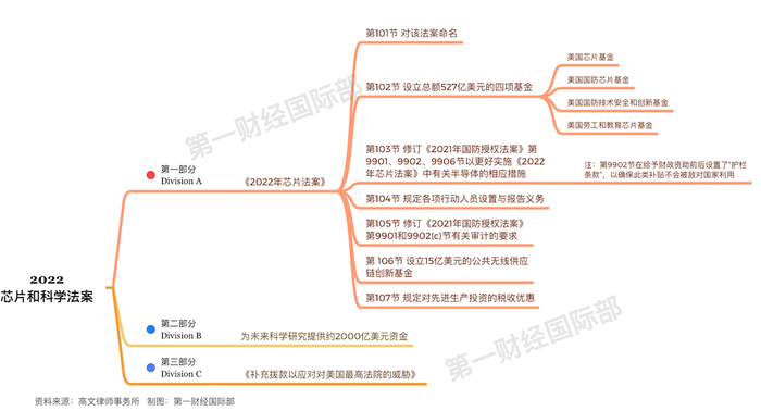《芯片和科学法案》包括三部分,其中的重头戏第一部分为“2022年芯片法案”,拟为半导体公司提供527亿美元拨款。