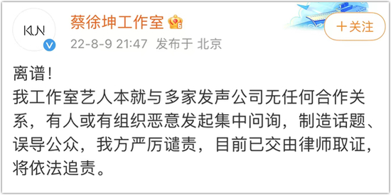 8月9日晚,蔡徐坤工作室发文直呼离谱:我工作室艺人本就与多家发声公司无任何合作关系,有人或有组织恶意发起集中问询,制造话题、误导公众,我方严厉谴责,目前已交由律师取证,将依法追责。