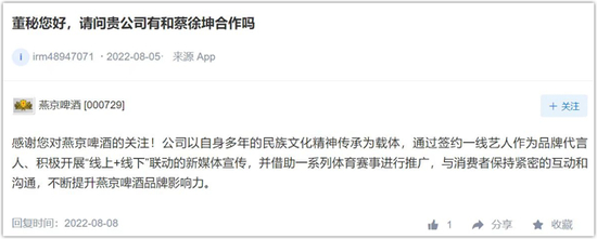 燕京啤酒的回复则显得艺术了许多,公司称,通过签约一线艺人作为品牌代言人、积极开展“线上+线下”联动的新媒体宣传,并借助一系列体育赛事进行推广,与消费者保持紧密的互动和沟通,不断提升燕京啤酒品牌影响力。