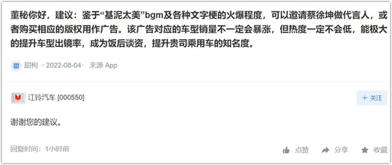 例如,8月5日,有投资者向江铃汽车建言:鉴于基泥太美、bgm及各种文字梗的火爆程度,可以邀请蔡徐坤做代言人,或者购买相应的版权用作广告。该广告对应的车型销量不一定会暴涨,但热度一定不会低,能极大地提升车型出镜率,成为饭后谈资,提升贵司乘用车的知名度。江铃汽车于8月10日回复称“谢谢您的建议”。