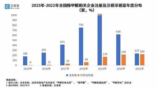 事实上,企查查数据显示,全国除甲醛相关企业总量3874家,现存2901家,有973家企业倒闭。其中,2019年吊销注销170家,2020年全年注销吊销216家,2021年全年注销吊销224家。