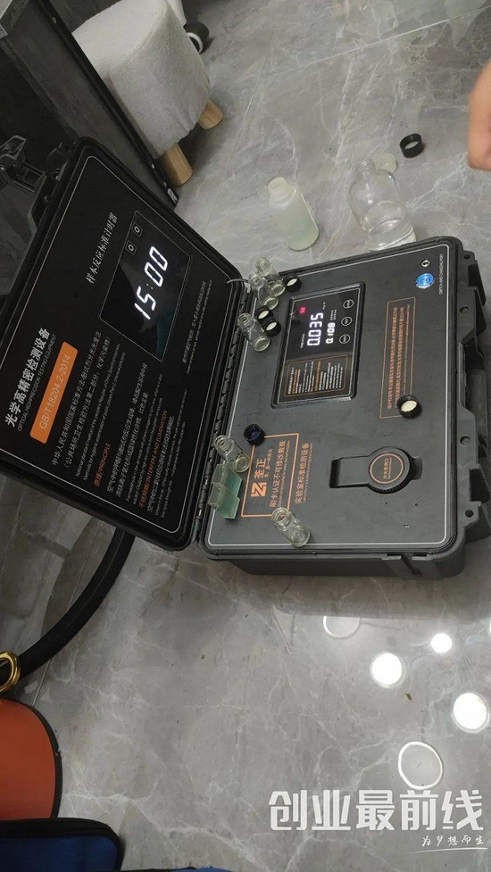 他观察到,工作人员做甲醛检测只需要架上甲醛检测装备,等着机器抽取空气,再滴入药剂等待,检测装备出结果后记录甲醛浓度。而甲醛治理则更简单,只需要在新房子喷洒药剂就行。
