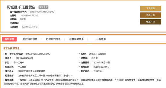 2021年7月16日,千钰百货店再次被历城市场监督管理局列入企业经营异常名录,理由是‘工商行政管理部门在依法履职过程中通过登记的经营场所及经营者住所无法与个体工商户取得联系的’。