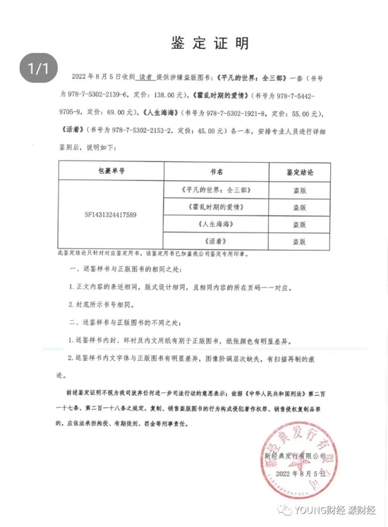 新经典图书公司为YOUNG财经出具的图书鉴定证明。有些出版方虽未出具纸质证明,但告知我们鉴别正版与盗版的方法 图/YOUNG财经