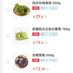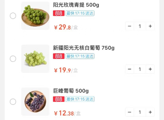 某电商平台显示,北京地区的阳光玫瑰青提也由此前数十元甚至上百元的价格,降至29.8元/斤。不过,阳光玫瑰的价格在各葡萄品种中依然是相对较贵的。该平台中的巨峰葡萄售价为12.38元/斤,新疆阳光无核白葡萄19.9元/750g。
