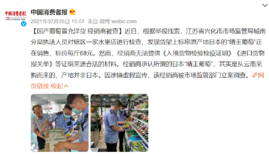 据中国消费者报报道,去年有商家因谎称销售的葡萄为日本“晴王葡萄”,被立案调查。2021年7月,江苏省兴化市市场监管局城南分局执法人员对辖区一家水果店进行检查,发现货架上标称原产地日本的“晴王葡萄”正在销售,标价每斤68元。