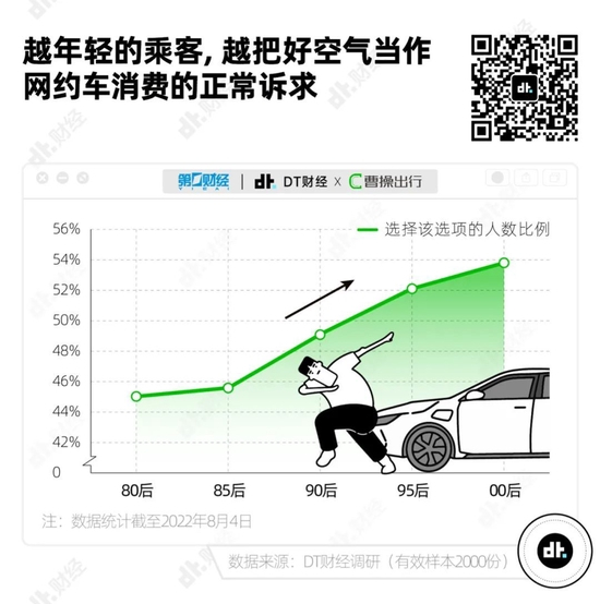 越年轻,就有越高比例的人将车内好空气视为网约车消费的正常诉求,53.9%的00后受访乘客认为,网约车好空气是消费者正常诉求。