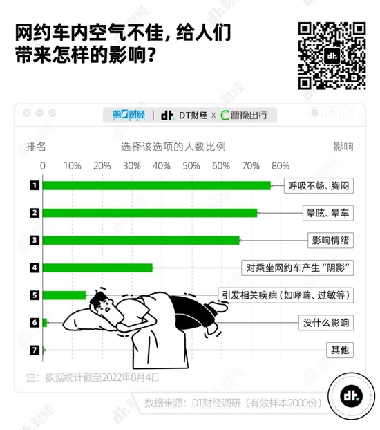 调研数据显示,超7成人曾经因为网约车内空气情况不佳,产生“呼吸不畅、胸闷”、“晕眩、晕车”等生理不适现象。