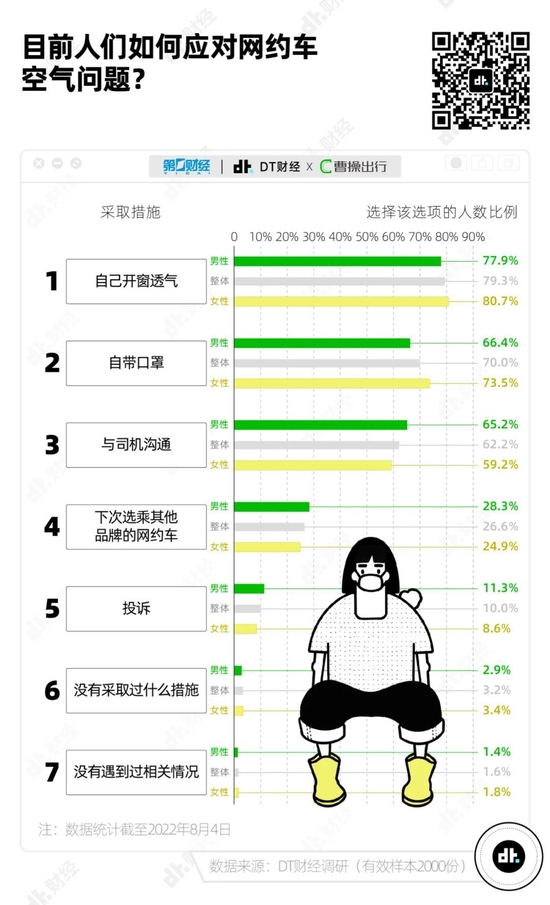 在回答“面临网约车的空气问题,你采取过哪些措施”这一问题时,79.3%的人选择“自己开窗透气”,70%的人“自带口罩”,也有超过6成人表示自己会主动“与司机沟通”。只有差不多1/10的乘客会选择投诉。