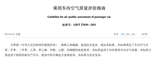 2011年,国家发布了《乘用车内空气质量评价指南》。2017年,环保部和国家质检总局联合制定的强制性国家标准《乘用车内空气质量评价指南》征求意见稿发布,重新明确了苯、甲苯、二甲苯、乙苯、苯乙烯、甲醛、乙醛、丙烯醛8种挥发性污染物的浓度限值。