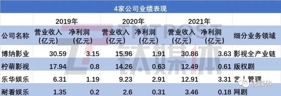 其中,博纳影业2020年营收相比2019年大跌,2021年营收回到2019年水平。主营版权剧的柠萌影视营收连续下滑。相比之下,主营网剧的耐看娱乐营收持续扩大,从2019年的1.35亿元升至2021年的3.46亿元。艺人管理公司龙头乐华娱乐营收也不断上涨,从2019年的6.32亿元上涨2021年12.91亿元,年复合增长率达43%。