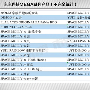 MEGA包括400%和1000%两种尺寸,前者高度约30公分,售价多在799元到1299元一体(也就是一只),后者高度86公分,售价多在3999元到6999元一体。泡泡玛特财报显示,在发售后的7个月内,MEGA系列为泡泡玛特创收1.78亿元。