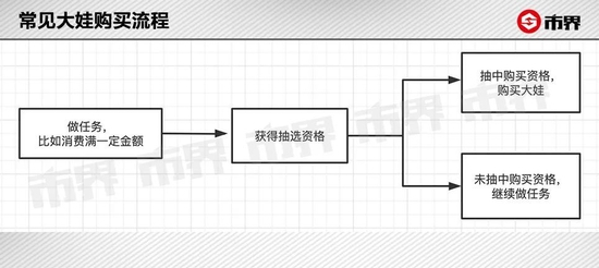 一般1000%尺寸的大娃产品,发售几百体已经算大量。即便泡泡玛特,也多限制在3500体以内。要想买,往往要先抽签获得购买资格。而抽签资格还要通过做任务获取。