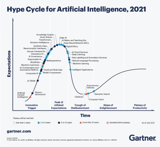 当前AI还在以快速的步伐发展,“成熟度曲线”上大部分技术,有希望在2年至5年内得到业界采用。边缘AI、计算机视觉、决策智能和机器学习等在内的创新,都会在未来几年对市场产生革命性的影响。