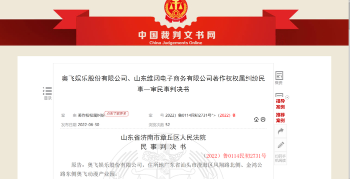 今年4月,奥飞娱乐(SZ002292,股价4.96元,市值73.34亿元)起诉山东维阔电子商务有限公司(以下简称山东维阔)著作权侵权案得到法院初审判决,后者在其拼多多店铺“大美丽的紫薇”中销售的拳击手套,就使用了奥飞娱乐享有著作权的“刑天侠”人物形象美术作品。[6]