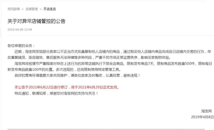 淘宝虽无明确对“无货源店铺”的清理活动,但其对复制他人店铺商品照片等行为也作出严格限制。同时,2019年4月,淘宝网还发布《关于对异常店铺管控的公告》,称发现部分卖家以不正当方式批量复制他人店铺内的商品,通过购买他人店铺内商品完成自己店铺内交易的行为,存在重复铺货、类目错放、售后服务无法保障等多种风险,严重干扰市场正常运营秩序,影响买家购物体验,并对这些店铺作出下架全店商品等处置。[5]