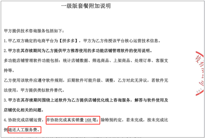 刘冰花了1980元买了课程,对方保证她的拼多多店铺1年最低销量达到168单,未完成则按比例退还人工服务费。但她没注意到的细节是,合同中,对方将1980元拆分为技术成本服务费1584元以及人工服务费396元,其中技术成本服务费即是各种软件的使用费。