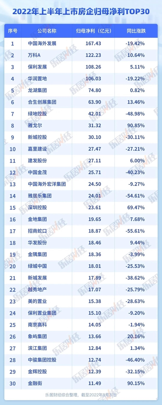 截至8月31日,上半年归母净利润榜单中,位列前五分别为中国海外发展、万科A、保利发展、华润置地、龙湖集团。前五名中仅龙湖一家是民企,其余房企均为国企或者央企。