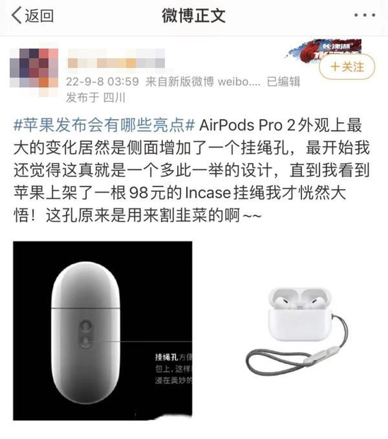“AirPods Pro 2外观上最大的变化居然是侧面增加了一个挂绳孔,最开始我还觉得这真就是一个多此一举的设计,直到我看到苹果上架了一根98元的Incase挂绳我才恍然大悟! ”有网友这样说。