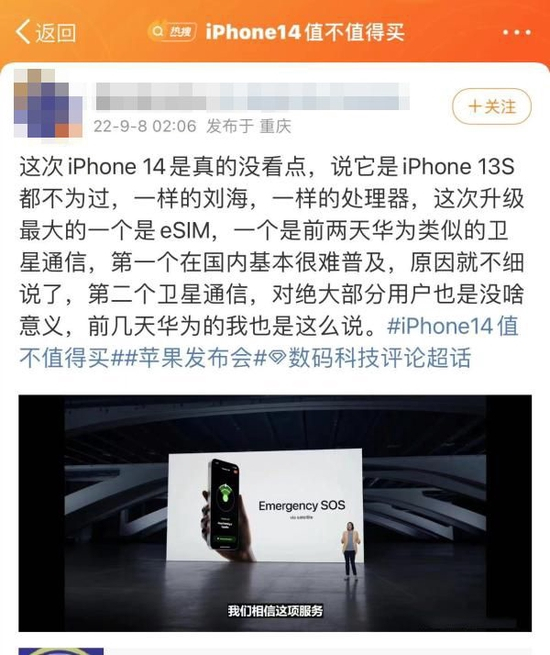 有微博网友表示:“这次iPhone 14是真的没看点,说它是iPhone 13S都不为过,一样的刘海,一样的处理器,这次升级最大的一个是eSIM,一个是前两天华为类似的卫星通信,第一个在国内基本很难普及,第二个卫星通信,对绝大部分用户也是没啥意义,前几天华为的我也是这么说。”