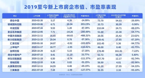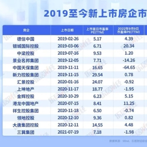 据乐居财经测算,2019年至今,新上市的14家房企,他们上市首日的平均市值为87.99亿港元,截至9月9日,只剩下33.14亿港元;原本平均市盈率为12.17,如今只剩下-2.58,可谓是一片凄然。