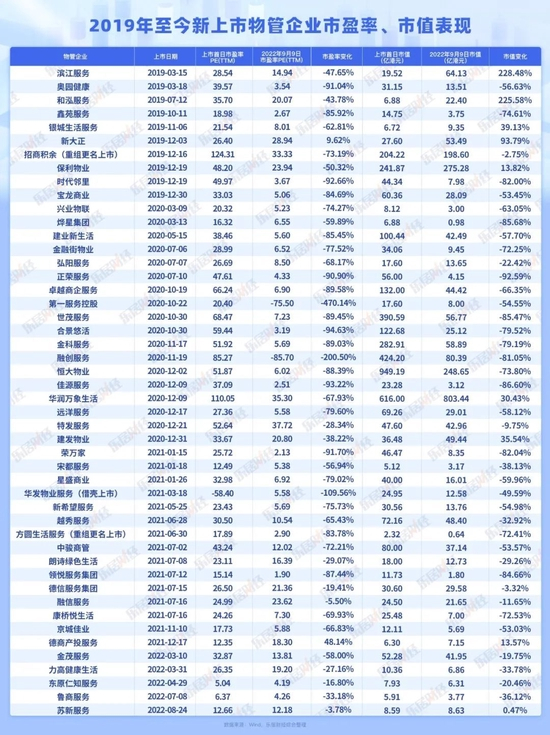 乐居财经统计获悉,2019年至今新上市的48家物管企业,它们上市首日的平均市盈率,高达33.84倍;但到9月9日,仅为7.3倍,同比下降了78.43%,跌幅惊人。其中,只有新大正、德商产投服务等实现了市盈率的提升,其余均有不同程度的跌落,35家下降的幅度甚至超过50%。
