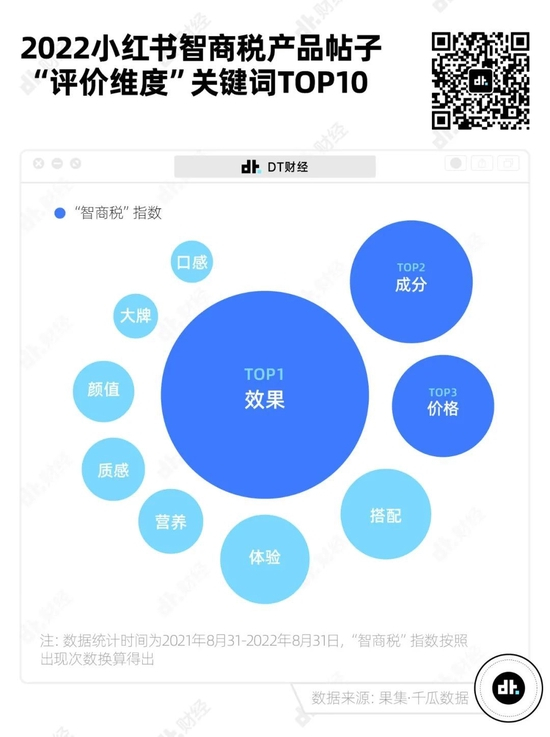 在小红书智商税笔记提到的关键词中,效果排名第一,接下来是成分和价格。