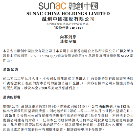 9月8日,融创公告,其收到陈淮军作为呈请人向香港高等法院提出的清盘呈请。内容有关融创未偿还呈请人持有的优先票据,涉及本金2200万美元及应计利息,案件聆讯时间拟定于2022年11月16日。