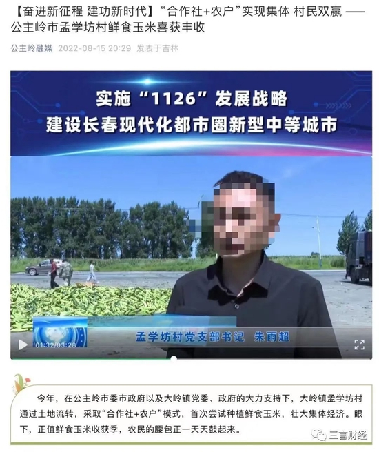 今年8月,吉林公主岭市当地节目“公主岭新闻联播”曾专门就当地玉米种植、收购情况做过一期新闻节目。其中,孟学坊村党支部书记朱雨超介绍称,今年孟学坊村种植的是鲜食玉米,采取合作社+农户的经营模式,以0.85元的价格回收,预计每亩地产值4万5000株,净收入8000至10000元。
