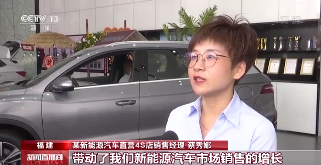 某新能源汽车直营4S店销售经理 蔡秀娜:因为免税政策的刺激,带动了我们新能源汽车市场销售的增长,上个月,我们福州地区的销量同比增长了254%。