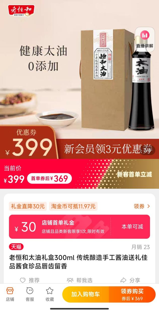 天猫的老恒和旗舰店内,300毫升的老恒和太油礼盒,号称采用传统工艺酿制、进行了四次套酿,售价399元。有网友表示,看过黄磊版的《深夜食堂》后,被剧中的“酱油拌饭”吸引,因此购入了天价的恒和太油,食用后对其倾心不已,吃完恨不得舔盘子。