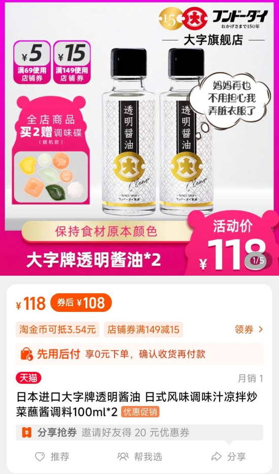在淘宝上,两瓶100毫升的日本大字透明酱油,售价118元。客服告诉潘哥:“透明酱油虽然口感上没有多大差别,也是酿造酱油的风味,但是透明酱油经过脱色加工处理,会比正常的酱油工序繁琐很多。”