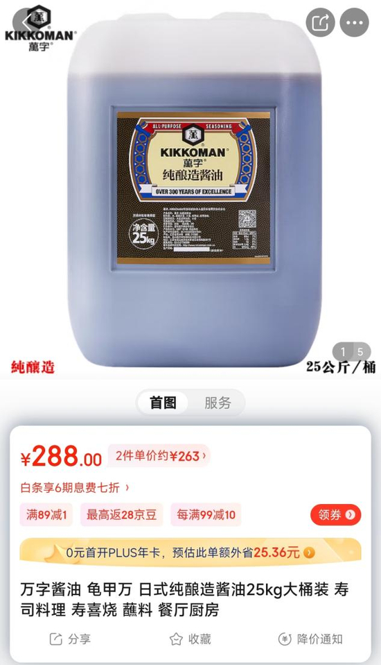 来自日本的万字酱油,拥有别具一格的桶装版本。在京东上,25公斤一桶的日本万字酱油,售价288元,如果购买两件,单价约为263元。