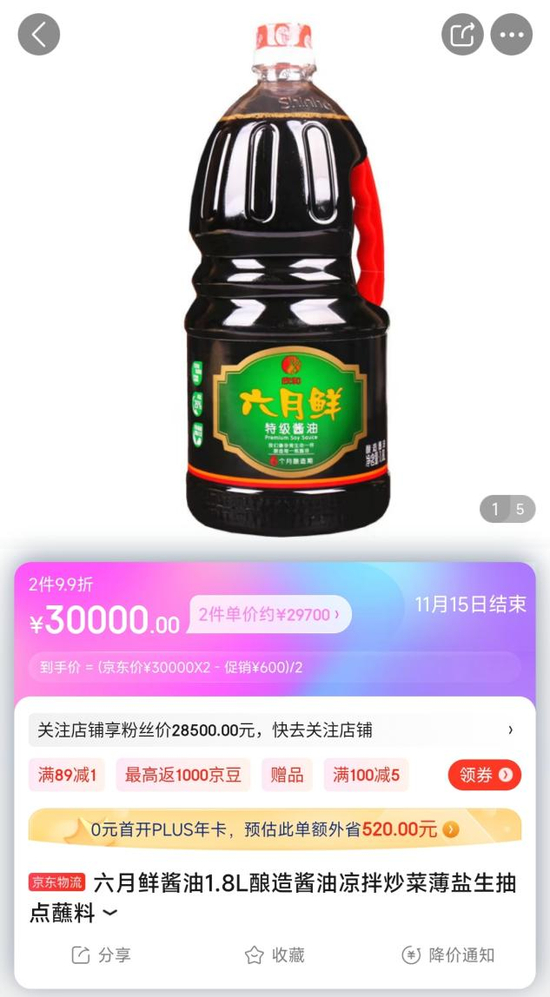 在京东上的某家店铺,潘哥发现1.8升的六月鲜特级酱油,售价竟然达到了3万元,享受2件9.9折的活动后,售价为29700元一瓶。