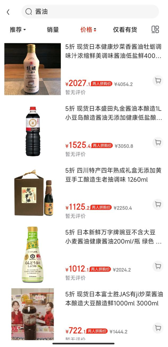 在京东上,潘哥发现有家茶叶专营店,正在5折销售天价酱油。其中,8瓶400毫升的日本东字牡蛎酱油,售价4054元,打折后2027元;1升的日本盛田丸金酱油,售价3050元,打折后1525元;5瓶200毫升的日本万字豌豆酱油,售价2024元,打折后1012元;而1260毫升的四川先市酱油,在这里标价2250元,折后价1125元。