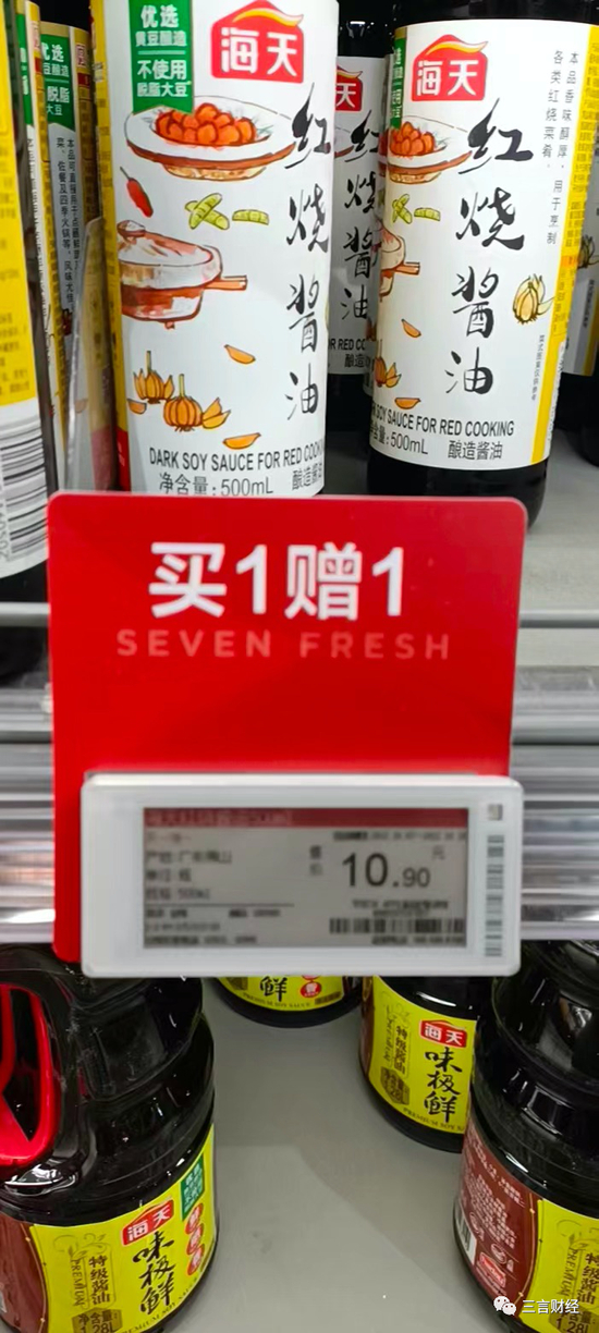 在三言财经走访的这几家超市,除了有一款海天红烧酱油有买一赠一的促销活动外,没看到海天的其他促销活动。不过,三言财经在朋友圈有看到好友发的海天生抽和0添加黄豆酱打折的促销活动。