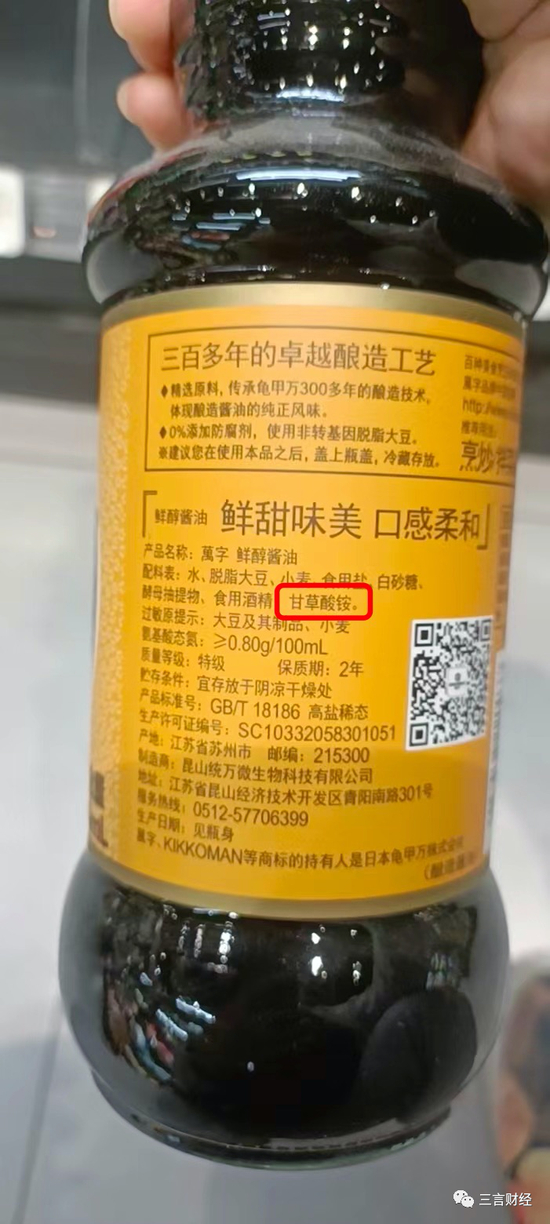 以下两块日本万字酱油的配料表中,都有一个名为“甘草酸铵”的化学物质。