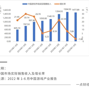 游戏工委发布的《2022年1-6月中国游戏产业报告》的数据显示,今年上半年,中国游戏市场收入为1477.89亿元,同比减少1.8%,这是国内游戏市场近7年来第二次出现同比增速下滑的情况。