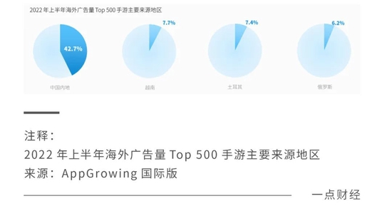 国产手游也凭借国内买量市场上沉淀的丰富经验和方法论,在海外买量市场一直保持第一梯队的位置。在2022上半年海外市场广告量最高的500款手游中,来自中国内地开发者的手游占到了42.7%,约是后三位之和的两倍。
