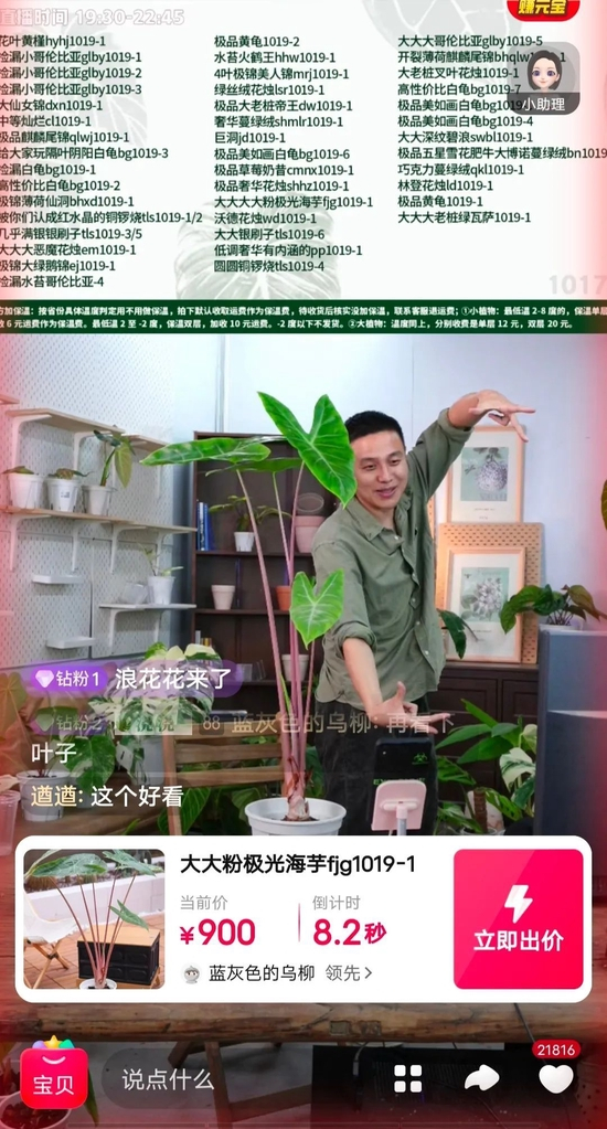 一株名为“极品黄龟”的绿植以1000元起拍,60秒的时间内经过21轮竞拍,最终以2000元的价格成交。这是19日晚发生在一个超16万人观看的直播间里的一幕。这株绿植只有四片叶子,折合后一片叶子500元。不过,这样的价格相较去年已是便宜不少,最火热的时候,精品绿植一片叶子就可卖到2万多元。